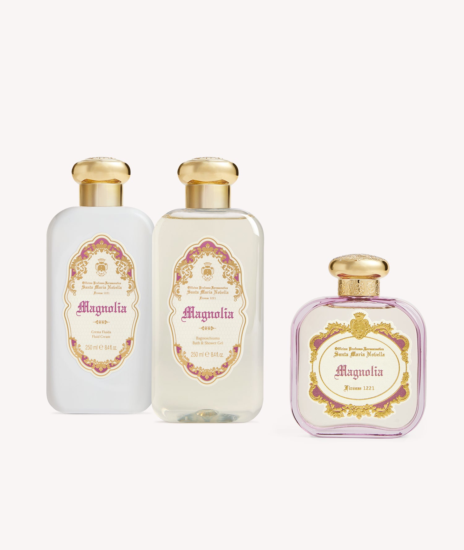 Embrace your skin with the velvety touch of Magnolia Fluid Body Cream, crafted with vegetable oils and butters. Its inebriating fragrance mirrors the olfactory universe of the Eau de Parfum it is named after.