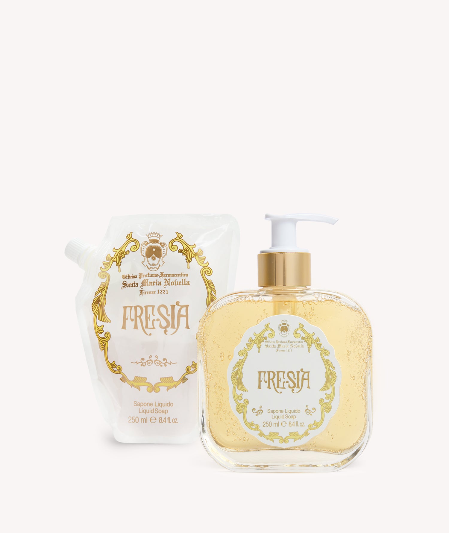Fresia Liquid Soap by Officina Profumo-Farmaceutica di Santa Maria Novella is an elegant liquid soap that embodies the delicacy and freshness of the freesia flower. This soap is a tribute to the beauty and purity of a beloved flower that graces the most lush gardens.