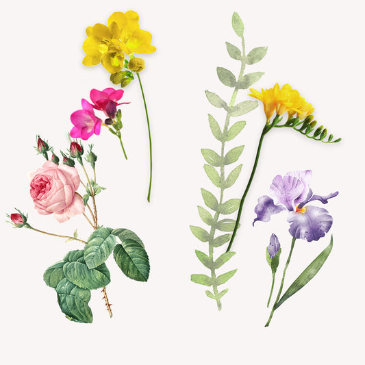 輝くブーケのフリージアが、南国の花々とその全てのエネルギーを吸い込むように誘います。